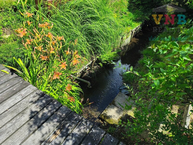 Vlastní pozemek je lemován malým potůčkem a živým plotem, vedle chaty je