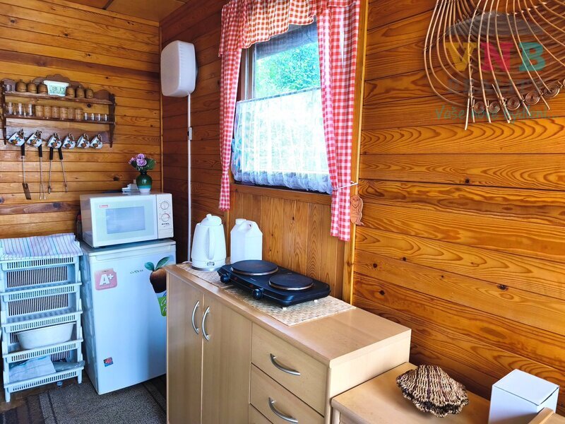 na spaní), je pohodlný vlez po dřevěných schůdkách. V chatě je také