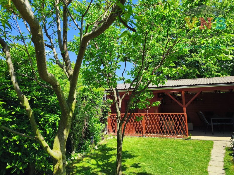 s dřevěnou pergolou s domečkem na nářadí, průchozí na vedlejší
